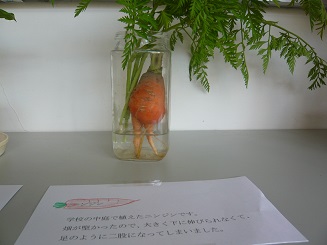 学校の畑に植えたニンジンです。畑が硬かったので大きく土の中に伸びられなくて二股になってしまいました。