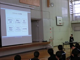 五限目に体育館で、スマホ・ケータイ安全教室を行いました。