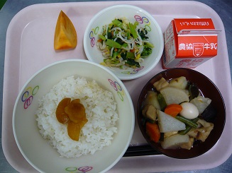 ごはん、含め煮、白菜のおかか和え、たくあんのつぼ漬け、柿、牛乳でした。