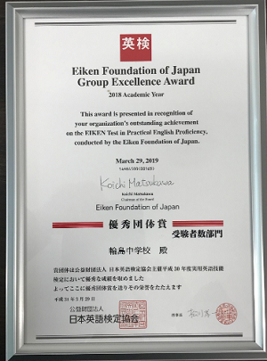 日本英語検定協会様より、「優秀団体賞」が届きました。