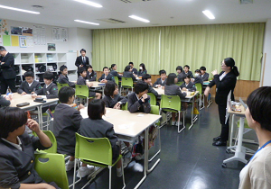 多目的室に集まった児童は、1年3組の生徒と一緒に、