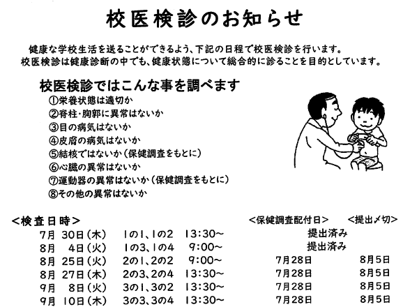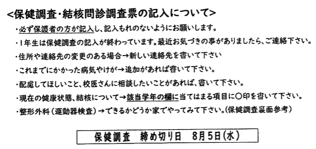 本日、保健調査票を配付しますので記入のうえ、ご提出をお願いします。