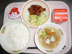 ごはん、トンカツ、キャベツサラダ、のっぺい汁、お祝いゼリー、牛乳