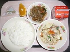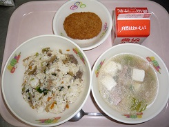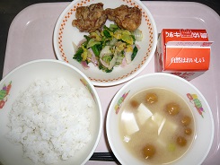 ごはん、とりのからあげ、おかか和え、みそ汁、牛乳