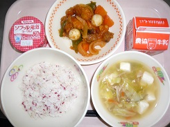 梅ごはん、酢豚、千切りスープ、ヨーグルト、牛乳