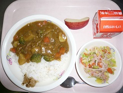 カレーライス、大根サラダ、福神漬け、リンゴ、牛乳