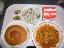 ミルクロール、スパゲッティソテー、カミカミサラダ、ピナッツクリーム、牛乳