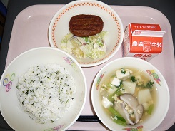 菜めし、ハンバーグ、おさつサラダ、たまごスープ、牛乳