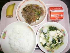 ごはん、トック、チャプチェ、バナナ、牛乳