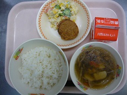ごはん、ミンチカツ、ポテトサラダ、のっぺい汁、牛乳