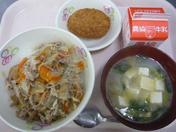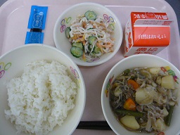 ごはん、肉じゃが、カミカミサラダ、のりの佃煮、牛乳