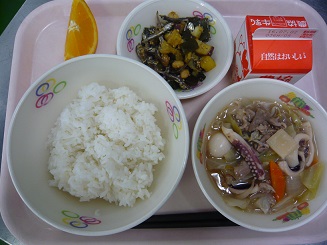 ごはん、八宝菜、小魚揚げ煮、オレンジ、牛乳