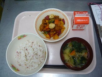 梅ごはん、酢豚、みそ汁、牛乳