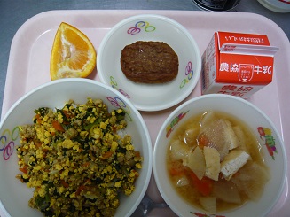 ごはん、卵とじ、五目きんぴら、オレンジ、とろろこんぶ、牛乳