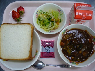 ミルク食パン、ビーフシチュー、野菜サラダ、クリーム、いちご、牛乳