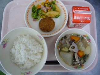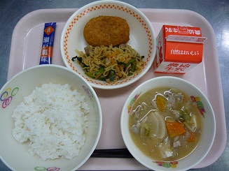 ごはん、コロッケ、切り干し大根のピリ辛炒め、豚汁、ふりかけ、牛乳