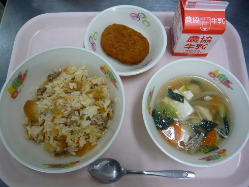 牛乳、キムタクごはん、コロッケ、鶏とごぼうのすまし汁