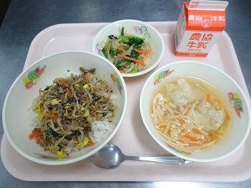 ビビンバ、ごま和え、ワンタンスープ、牛乳