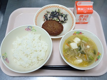 ごはん、ハンバーグ、ひじきのサラダ、キムチスープ、牛乳