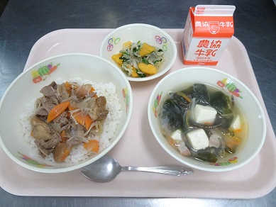 ごはん、豆腐のカレー煮、五目なます、フルーツ、牛乳