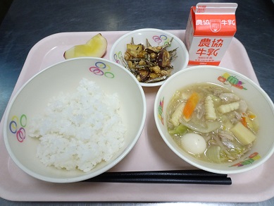 ごはん、八宝菜、小魚揚げ煮、フルーツ、牛乳