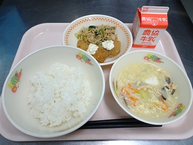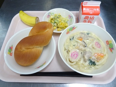 米粉パン、かきたまうどん、かぼちゃサラダ、フルーツ、牛乳