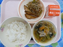 柳川鍋は、本来はどじょうで作るそうですが、給食では、豚肉、ごぼう、しいたけなどをしょうゆ味で煮て、卵でとじた柳川風煮として出しています