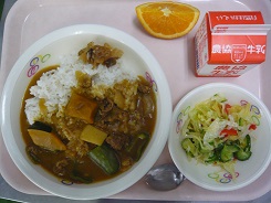 夏野菜カレー、金糸瓜サラダ、福神漬け、オレンジ、牛乳