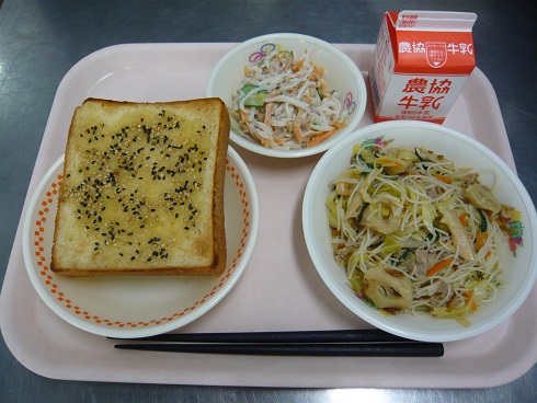 牛乳、ごまトースト、焼きビーフン、かみかみサラダ