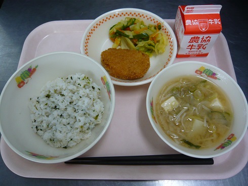 牛乳、菜めし、チキンカツ、キャベツソテー、みそ汁
