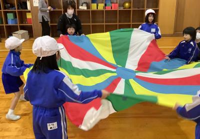 輪島分校は、門前東・西小学校のみなさんとバルーンを使った表現遊びをしました。小学校のみなさんと一緒に活動したことで、人と人の間隔が狭まりバルーンが大きく膨らみ、きれいなおやまができました。