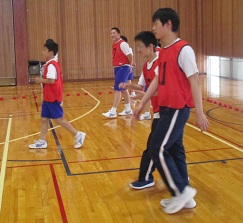 輪島分校の体育館でボッチャ、ドッヂビーを混合チームに分かれて行い、