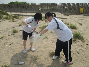 門前高校1,3年生と一緒に、高等部のみんなで、道下サンセットパーク裏の海岸で、ゴミ拾いをしました。蒸し暑いお天気でしたが、軍手にゴミばさみ、ゴミ袋で頑張りました。