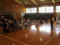 輪島分校でも、地震が起こった想定で避難訓練を行いました。みんな自前の防災ずきんを被り、しっかり「お・は・し・も」の約束で避難することができました。