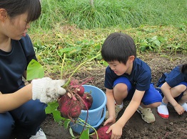 9月に入り、学校の畑で、各学部サツマイモの収穫をしました。1学期に苗植えをして、少々ほっぽらかしていましたが、夏休みの異常天気にも耐え、見事に大きなサツマイモになっていました。ずっしり重くて大きいサツマイモ、どんなにおいしいものに変身するのか楽しみです。