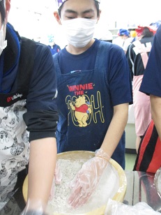 門前高校のそば作りに中学部が参加しました。門前高校、門前中学の生徒さんたちと一緒です。体重をかけて、ぐっと力を入れてこねました。出来上がりは上々でした♫