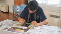 はじめにイラストの線を板に写し、気を付けながら下写しした線を漆の付いた筆でなぞりました。蒔絵師の方と配色を決めて色を付けていきました。