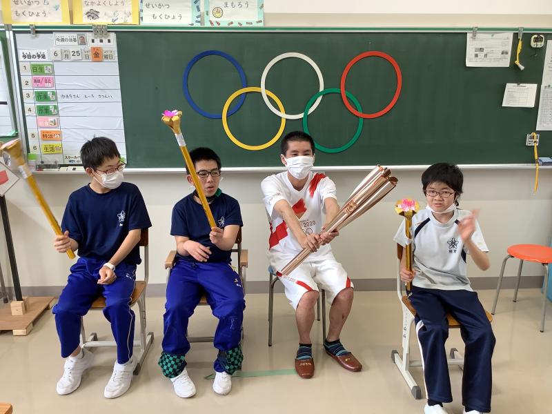 各学部の児童生徒と記念写真を撮っていただきました。一人一人トーチも持たせていただき感激しました。高等部で三年間担任した山花先生とも再会することができました。楽しい時間をありがとうございました。