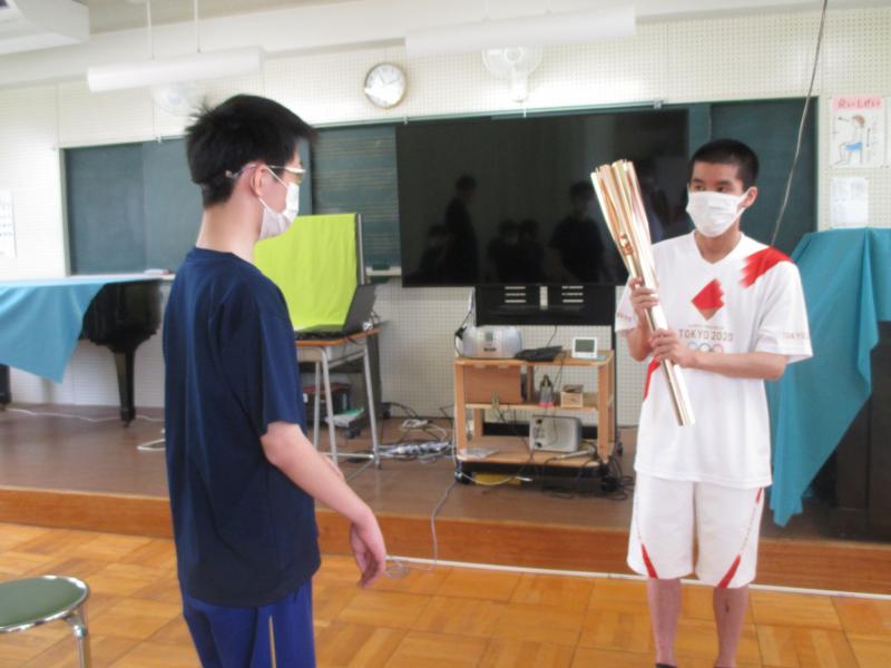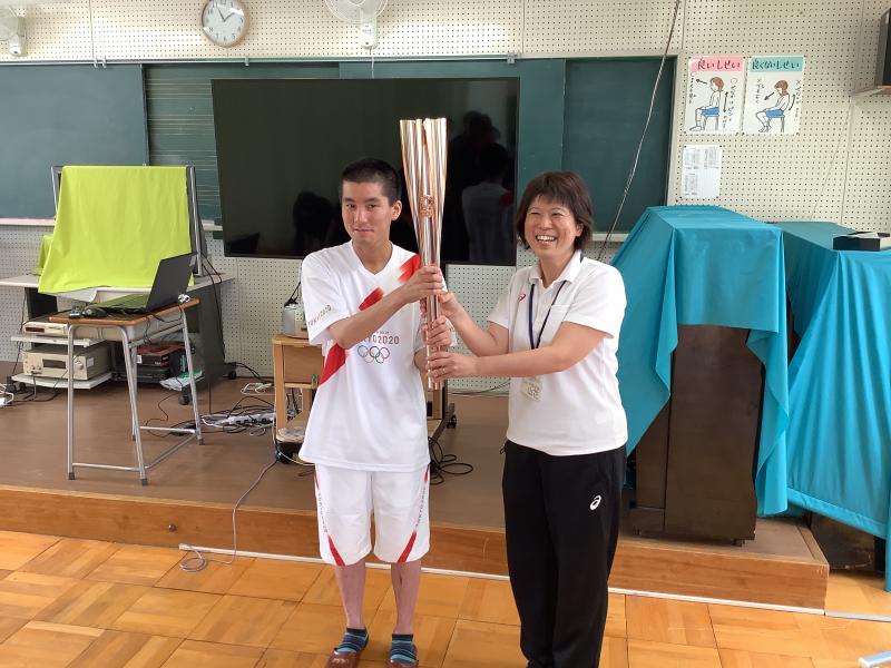 6月25日金曜日、東京オリンピックの聖火リレーのランナーに選ばれた輪島分校の卒業生がトーチを持って来校してくれました。