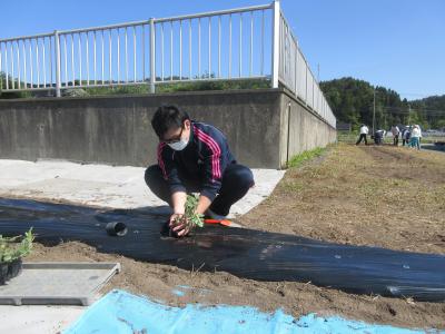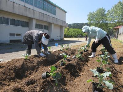 5月14日(木)学校の畑に野菜を植えました。例年は、農業委員さんに教えていただきながら子どもたちで植えるのですが、今年は休校中のため先生たちで植えました。みんなが元気に登校する頃には、大きく育っていることでしょう。