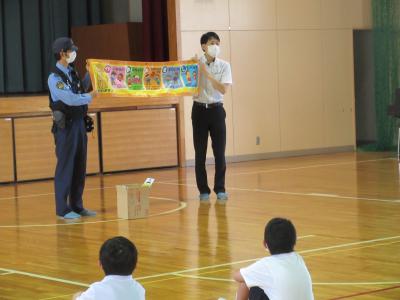 7月31日(金)全校で防犯教室がありました。珠洲警察署と若山駐在所のおまわりさんにお越しいただき、夏休みを安全に過ごせるよう、防犯について教わりました。「いかのおすし」を守ること、もし捕まえられたときはどうすればよいか、逃げ方や大声の出し方などをみんなで練習しました。あってほしくはありませんが、いざという時に役立てたいですね。