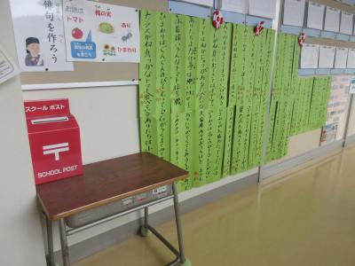 毎月、季節に合わせたお題(季語)が校長先生からから提示されると、子どもたちは「5・7・5」と指を折りながら、一生懸命に頭をひねらせて句を詠んでいます。作った俳句を職員室前のポストに投稿すると、作品はすべて掲示されます。