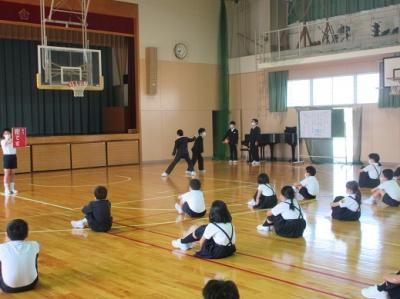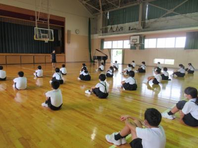 まずはじめに、校長先生から「新しい生活様式」についてのお話がありました。校長先生が「『新しい生活様式』という言葉を聞いたことがありますか?」と尋ねると、高学年を中心に3分の1ほどの手が挙がりました。一人ひとりがしっかり考えて行動することが大切だというお話を、みんな真剣な表情で聞いていました。