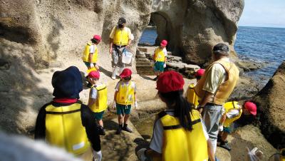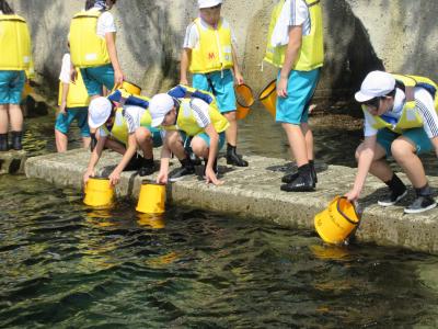 「のと海洋ふれあいセンター」では、マリンシアターを見て、館内見学をした後、1、2年生と3~6年生に分かれて、九十九湾の磯観察を行いました。箱めがねで水中の様子を観察したり、貝やエビ、カニなどを捕まえたりしました。みんな夢中になって磯の生き物とふれあっていました。