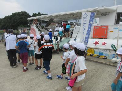 お弁当を食べてから、午後からは場所を移動し、6月にオープンしたばかりの「イカの駅つくモール」に行きました。館内の説明を聞いた後、遊覧船に乗りました。海底をのぞける窓から魚を眺め、九十九湾の景色も楽しみました。少しでも魚が見えると、みんな大喜びでした。