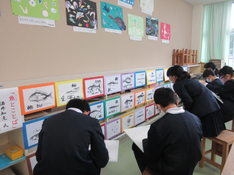 津幡町在住の酒井知克氏が「魚とことば」シリーズを制作し、寄贈してくださいました。名前を盛り込んだメッセージが書かれた魚の絵です。5・6年生がその中から自分の好きな絵を選んで模写し、お礼の意味をこめて酒井氏へお送りしました。酒井氏の絵とユーモアたっぷりのメッセージがとても素敵なので、児童は進んで何枚も描いていました。変化の激しいこれからの社会、児童には時代の流れで考える「魚の目」をもってほしいです。