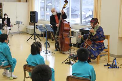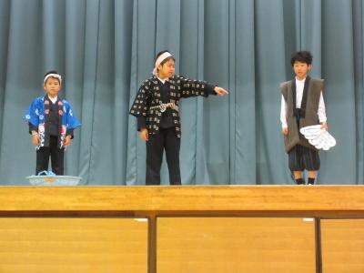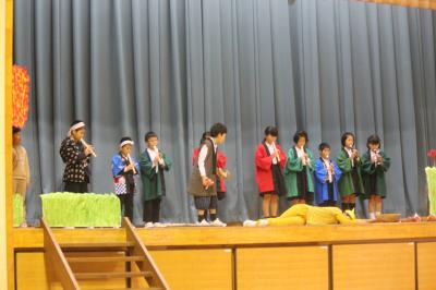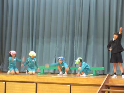 1・2年生は,音読の発表や演奏,8の字とび,けん玉・こま回しをしました。