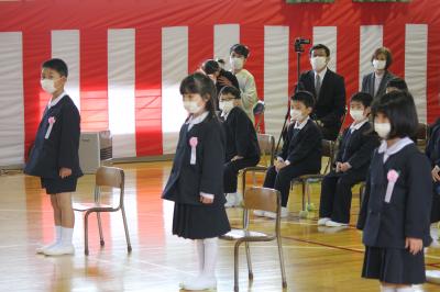 つづいて、入学式が行われました。3名のかわいい新入生が、若山っ子の仲間に加わりました。 みんな上手に返事や起立、礼ができました。姿勢も大変よく、とても立派でした。大きな体育館、たくさんの人で緊張したことでしょう。 校長先生が「わかやま」の4文字を使って[わらい][かがやき][やさしさ][まなび]のある若山小学校になるようにと話されました。今日から若山小学校の1年生として、しっかりがんばりましょう。