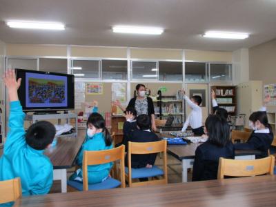 図書館司書の松原先生から、学校図書館の使い方について教わりました。「としょかんって、つなかん?」「としょかんって、みかん?」など、クイズ形式の絵本を見ながら楽しく図書館のしくみや使い方について学ぶことができました。これから、図書館にたくさん通って、色々な本を読みたいですね。