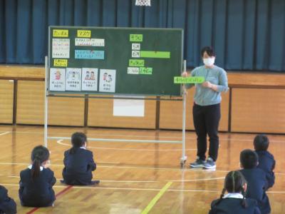 次に、養護の白坂先生から、保健のお話がありました。「3みつをさける」「せきエチケット」「マスクでのすごし方」「てあらい」について、イラスト付きでわかりやすく説明してもらいました。